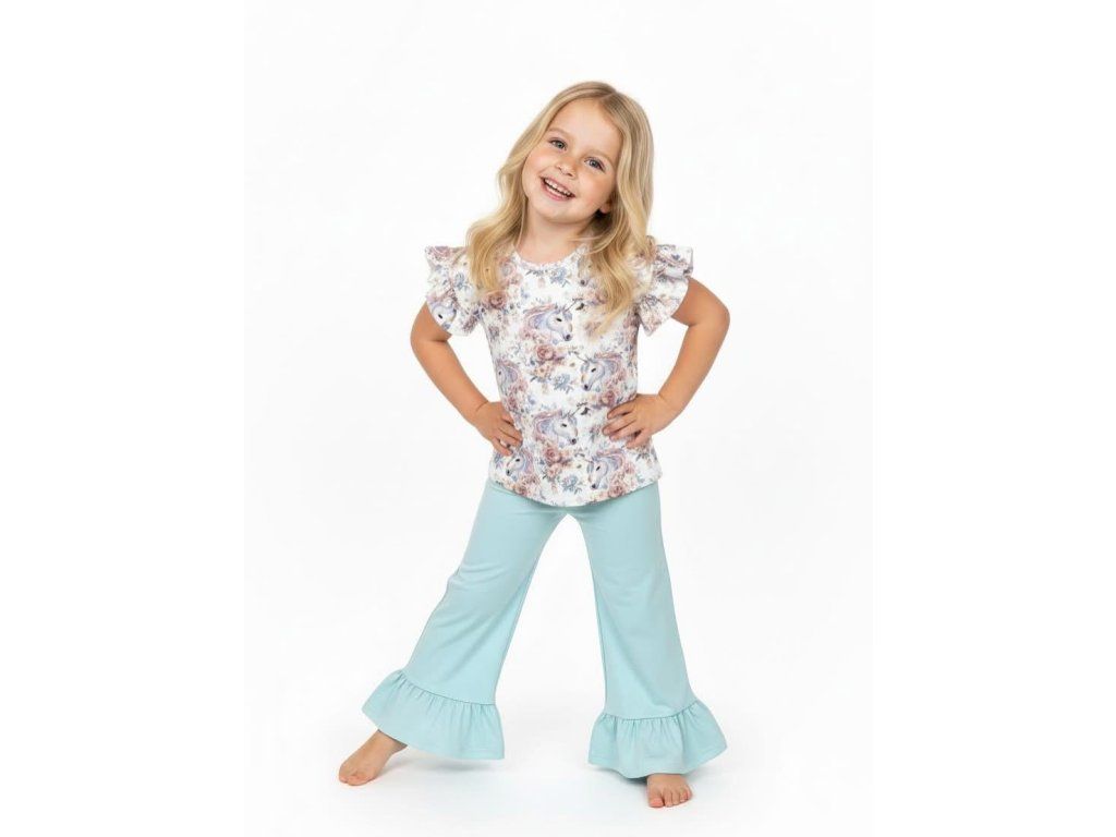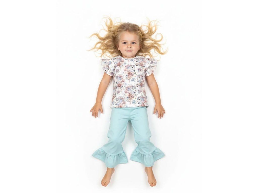 Štýlový a pohodlný detský komplet pozostáva z trička s krátkym rukávom s obľúbeným jednorožcovým motívom a spodného dielu – teplákov alebo legín s voľnejším strihom, zakončených jemným volánom v spodnej časti. Tento hravý detail dodáva outfitu jedinečný a dievčenský vzhľad.