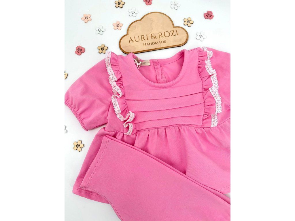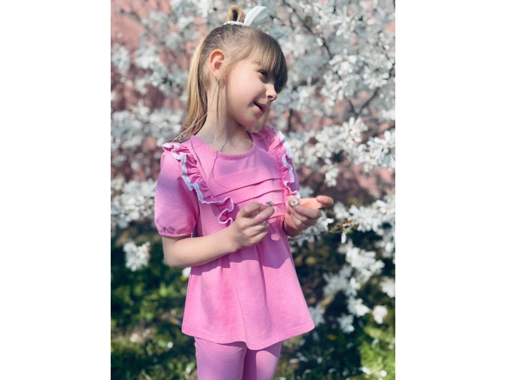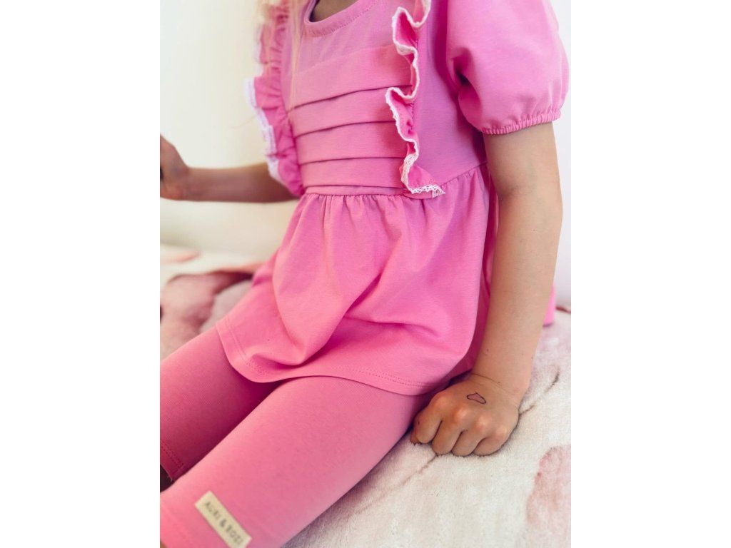 Malinový letný set pre dievčatká pozostáva z krátkej tuniky a pohodlných kraťaskov. Jemný, príjemný materiál je ideálny na teplé dni a zaručí komfort počas celého nosenia. Tunika má voľnejší strih, ktorý krásne sadne, a kraťasky sú praktické a pohodlné na každodenné nosenie.