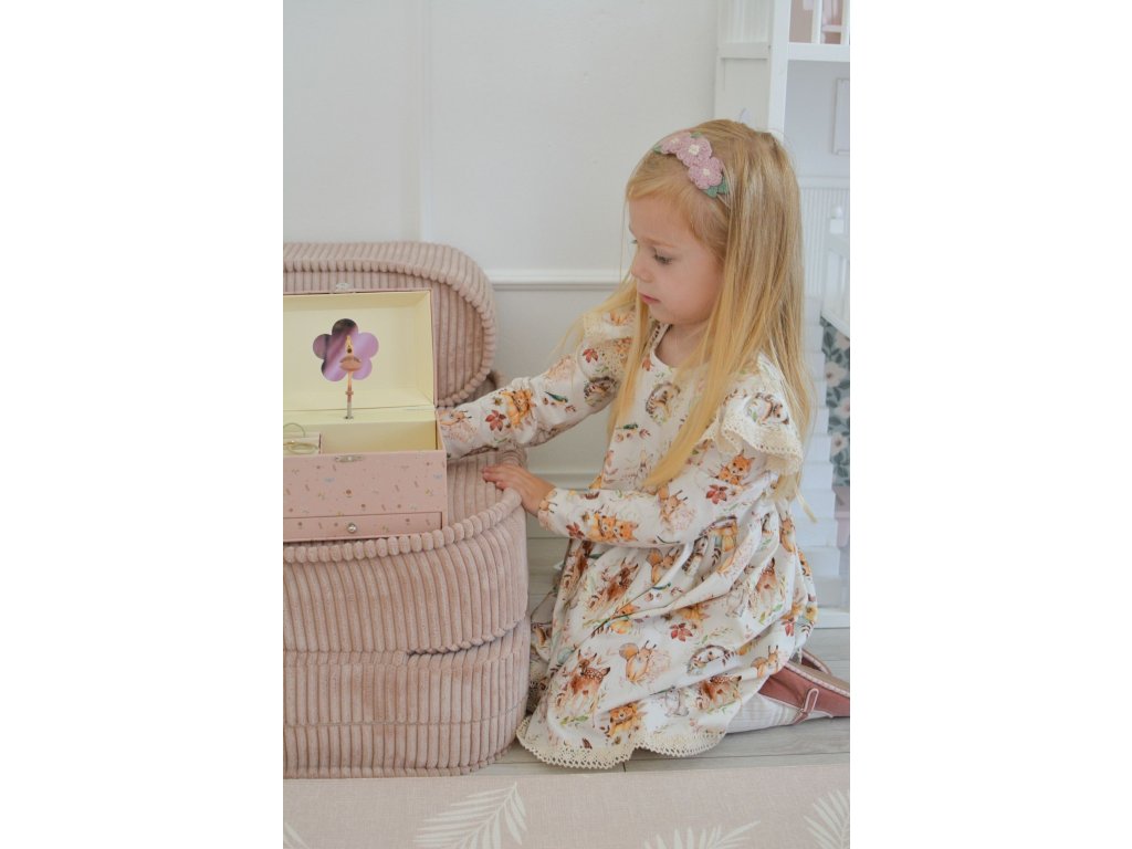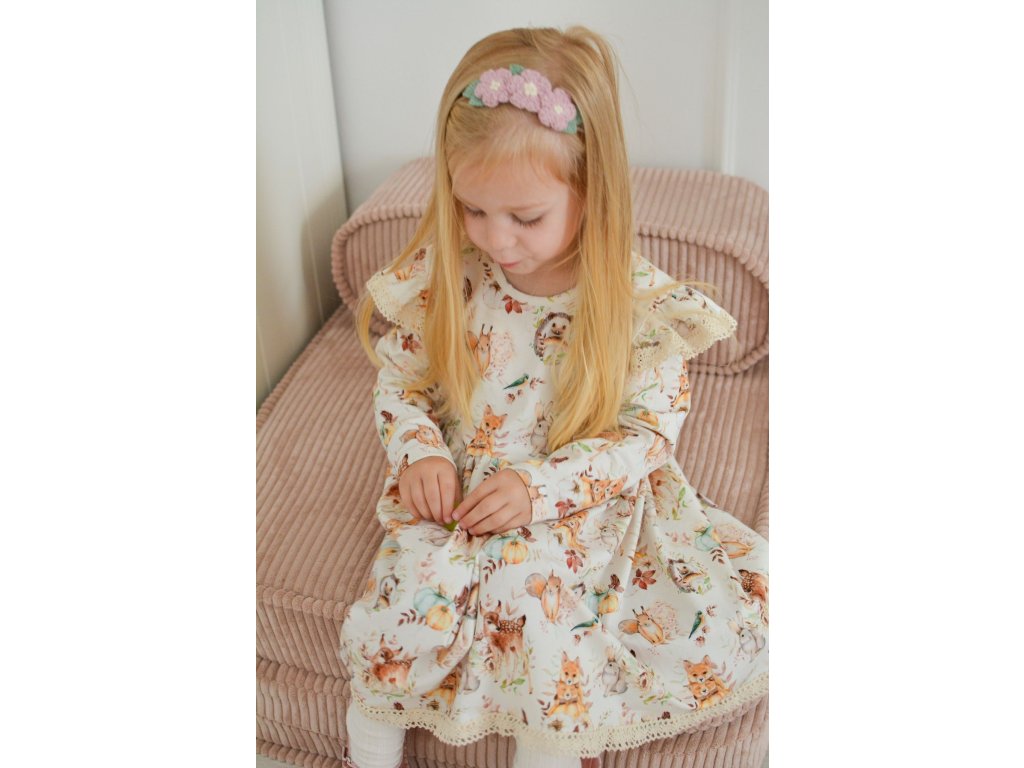 Rozkošné detské šaty s dlhým rukávom a motívom lesných zvieratiek potešia každú malú parádnicu. Jemná látka s podielom elastanu pôsobí luxusne na dotyk, je priedušná a pritom sa krásne prispôsobí detskej postave. Hravo zladený vzor lesných zvieratiek dodáva šatám jedinečný, rozprávkový vzhľad.