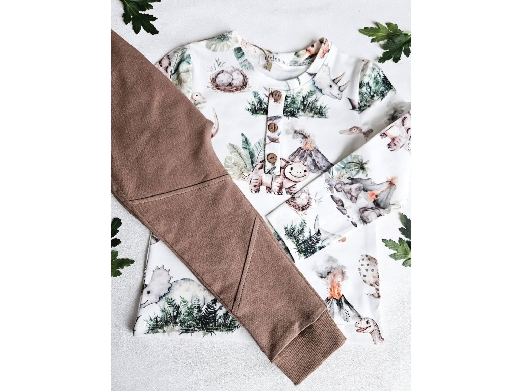 Biele tričko s rýdzo chlapčenskou potlačou Dinosaurus v kombinácii s hnedými tepláčkami. Komplet vyzerá krásne spolu, no viete ho jednoducho kombinovať aj s inými kúskami zo šatníka. Tričko aj tepláčky sú vyrobené z prémiovej bavlny, ktorá je príjemná na dotyk a zabezpečí Vášmu chlapcovi pohodlie počas celého dňa. Komplet je vhodný na každodenné nosenie, do škôlky aj školy.