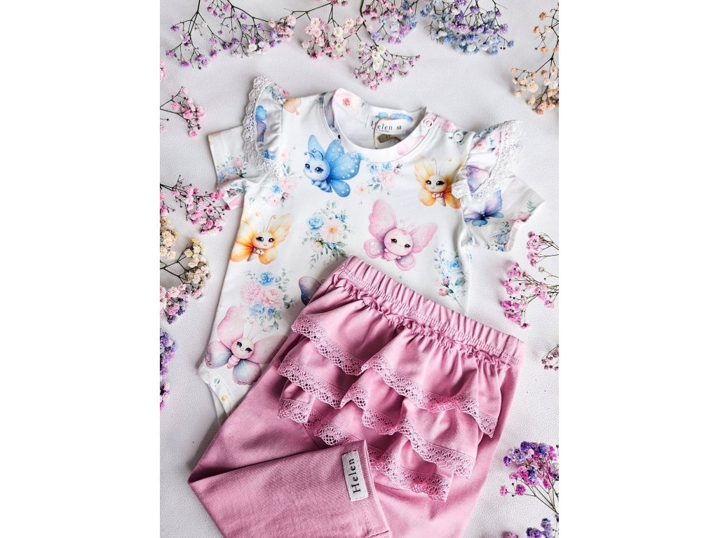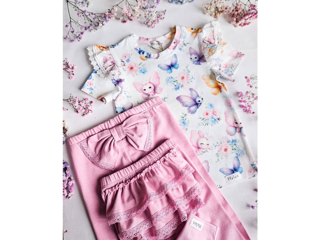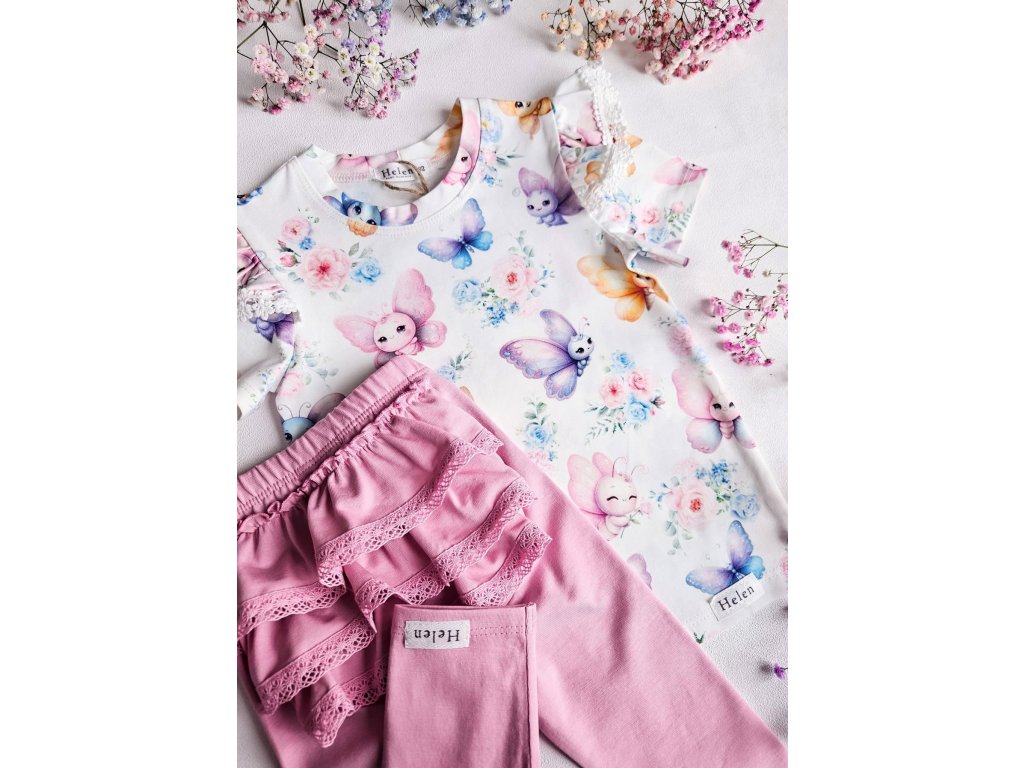 Jemné tóny kvetov a motýle na bielom podklade dokonale zladené s baby pink legínkami. Táto kombinácia farieb a potlače priam privoláva jar. legínky sú navyše doplnené o krásny prvok na riťke - pri menších veľkostiach tri všité volániky, pri väčších veľkostiach mašľa. Oblečenie je veľmi pohodlné, ušité z príjemnej bavlny, vhodné na každodenné nosenie.