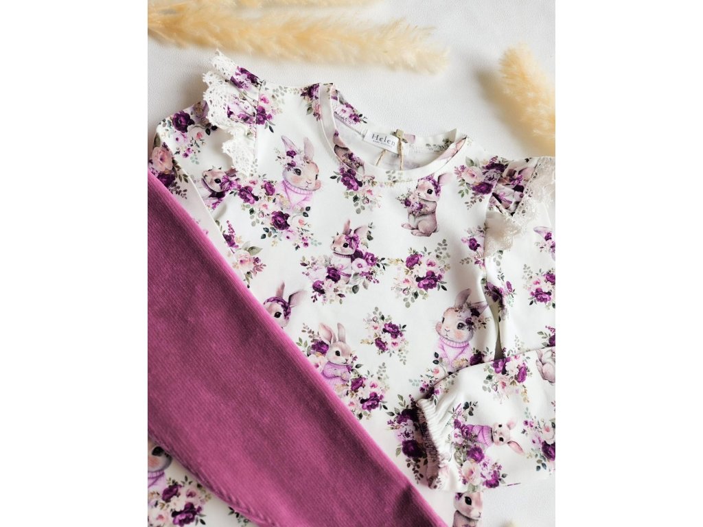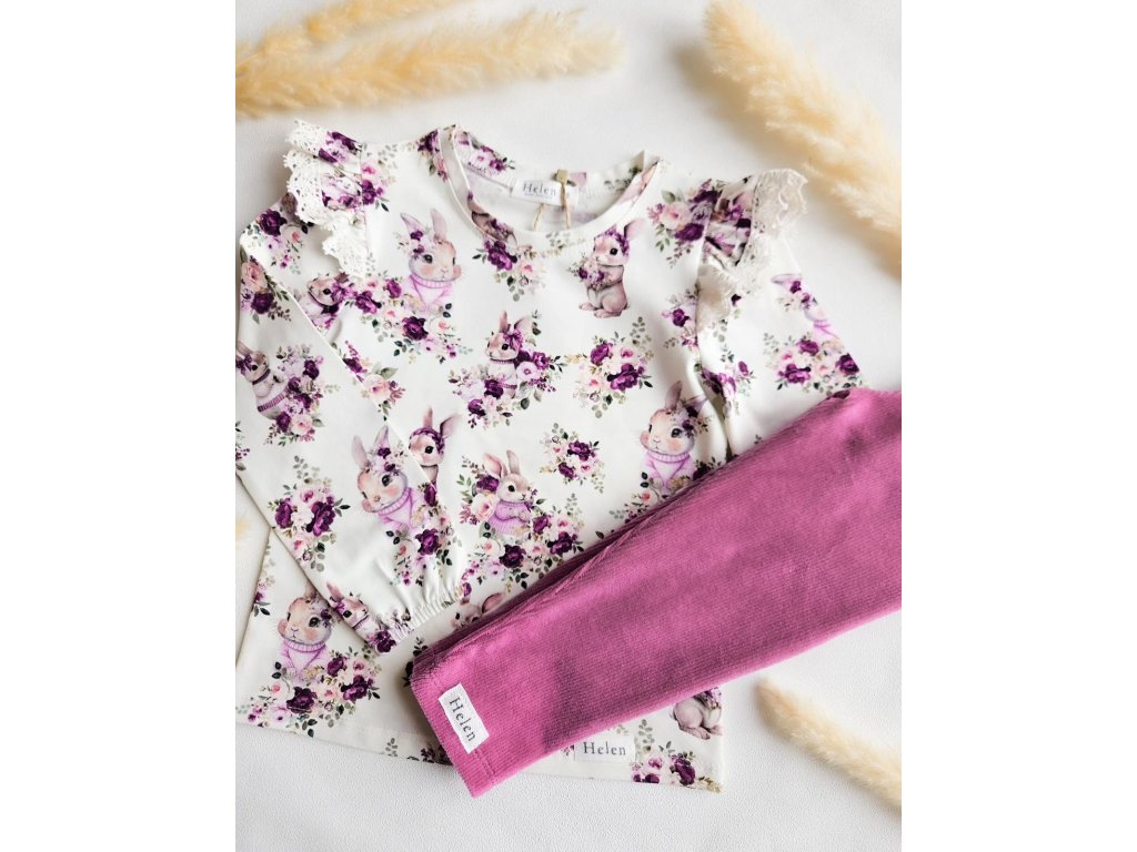 Nádherná súrodenecká kolekcia z dielne HELEN. Jednofarebné sýtoružové velúrové leginky a tričko s jesennou potlačou.