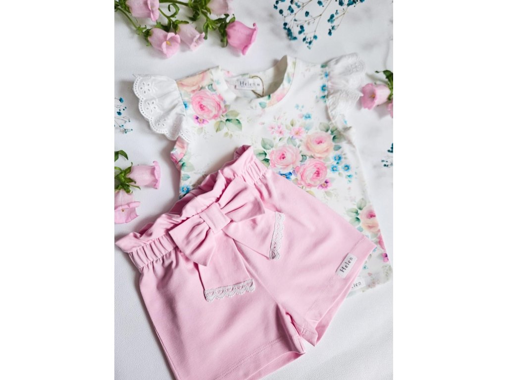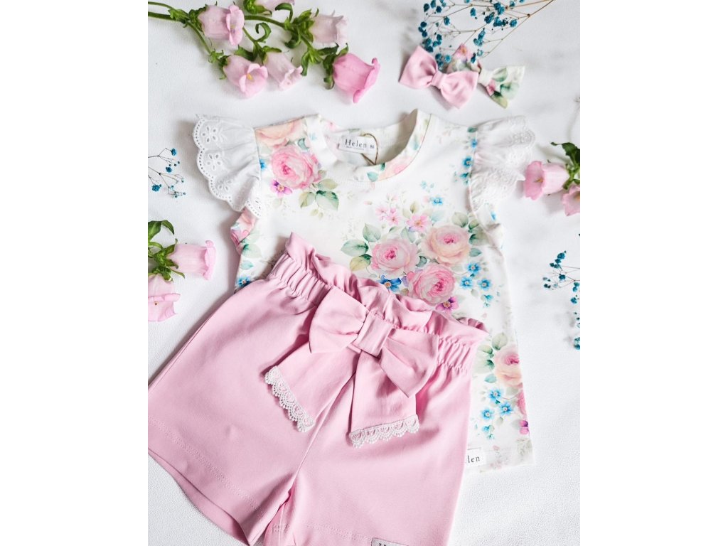 Opäť privolávame leto s týmito nádhernými letnými kompletmi. Tričko s čipkovanými rukávmi a nádhernou kvetinovou potlačou na bielom podklade je pekne zladené s babypink kraťaskami. V prednej časti kraťaskov je výrazná ale zato decentná mašľa.