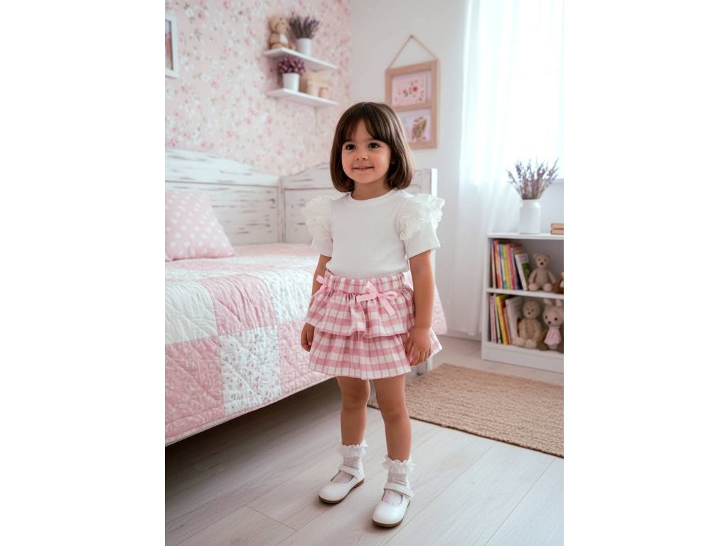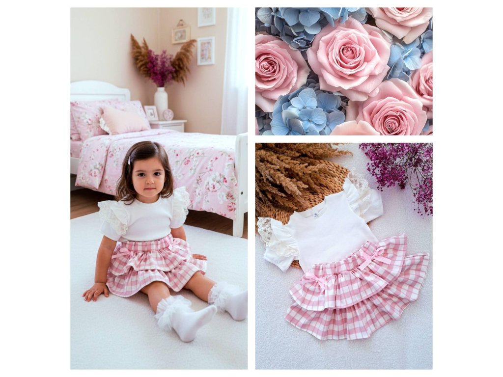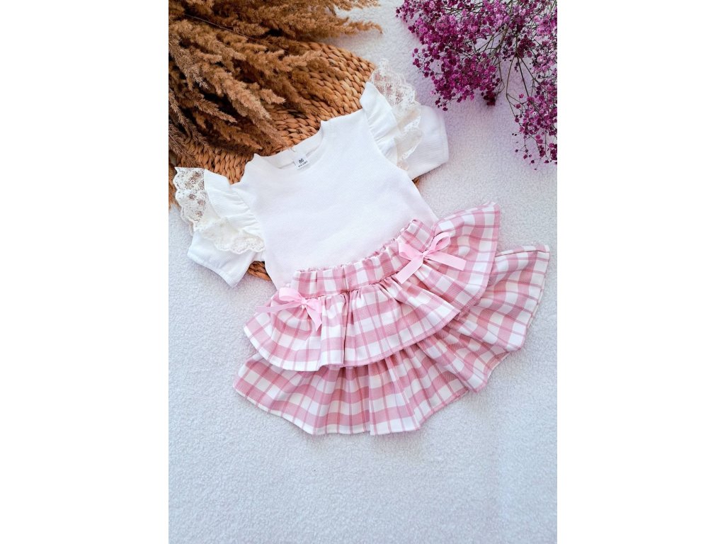 Luxusný komplet pre malé parádnice pozostávajúci z bieleho trička a jemnej ružovej sukničky. Vyrobený z kvalitného, príjemného bavlneného materiálu, ktorý je šetrný k detskej pokožke a zaručuje maximálne pohodlie počas celého dňa. Elegantný a zároveň hravý dizajn robí z tohto kompletu ideálnu voľbu na bežné nosenie aj špeciálne príležitosti.