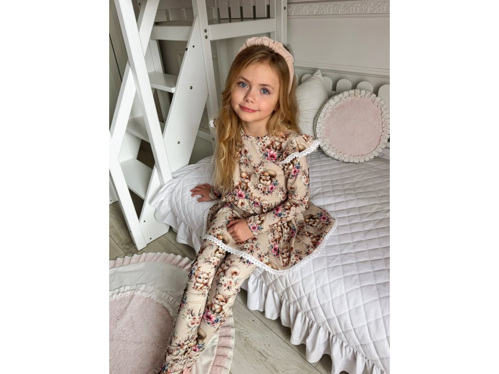 Komplet zdobí rozkošný motív zajačika v jemných a nežných farbách, ktoré pôsobia veľmi dievčensky a elegantne. Ideálny je na bežné dni, škôlku, prechádzky aj rodinné stretnutia.