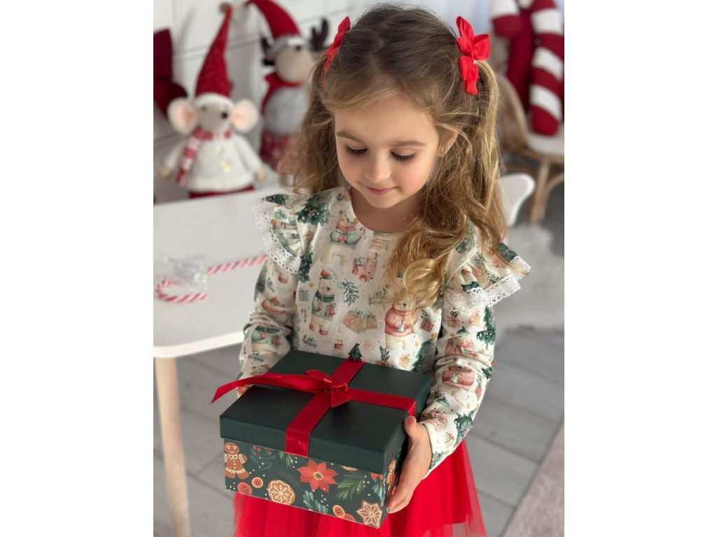 Roztomilé vianočné tričko pre dievčatá, ktoré si okamžite získa srdcia malých princezien. Tričko zdobí milý mackový motív s jemnými sviatočnými detailmi, vďaka ktorým je ideálne na predvianočné obdobie, fotenie aj sviatočné dni.