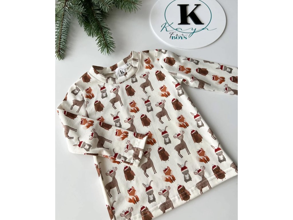 Rozžiarte detské Vianoce s roztomilým tričkom s motívom lesných zvieratiek! Mäkký a príjemný materiál z čistej bavlny s prímesou elastánu zaručí pohodlie počas celého dňa – ideálne na sviatočné fotenie, rodinné návštevy aj zimné radovánky.